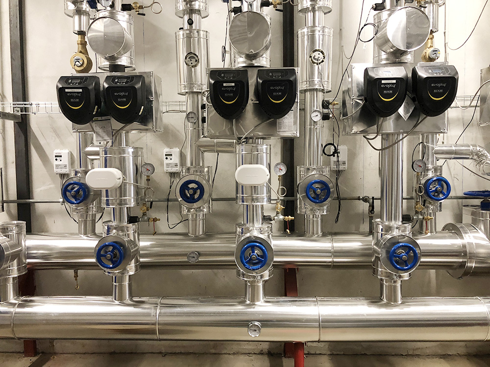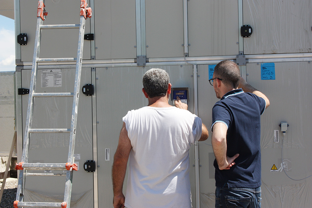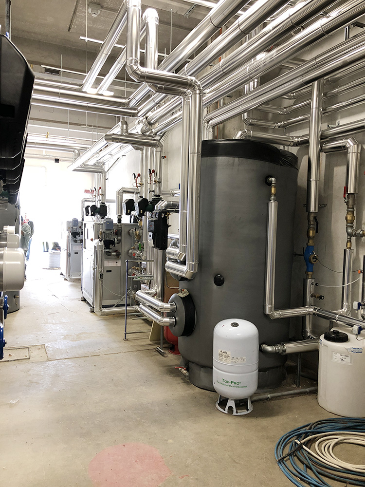 L’impianto consiste in una centrale alimentata da pompe di calore geotermiche in batteria, per una potenza installata di circa 200 kW, con relativi accumuli inerziali per acqua calda e refrigerata, accumulo per acqua calda sanitaria e sistema di termoregolazione. All’interno dell’edificio l’erogazione del riscaldamento e dell’aria condizionata avviene principalmente mediante fancoil del tipo a cassetta a quattro vie installate a controsoffitto.