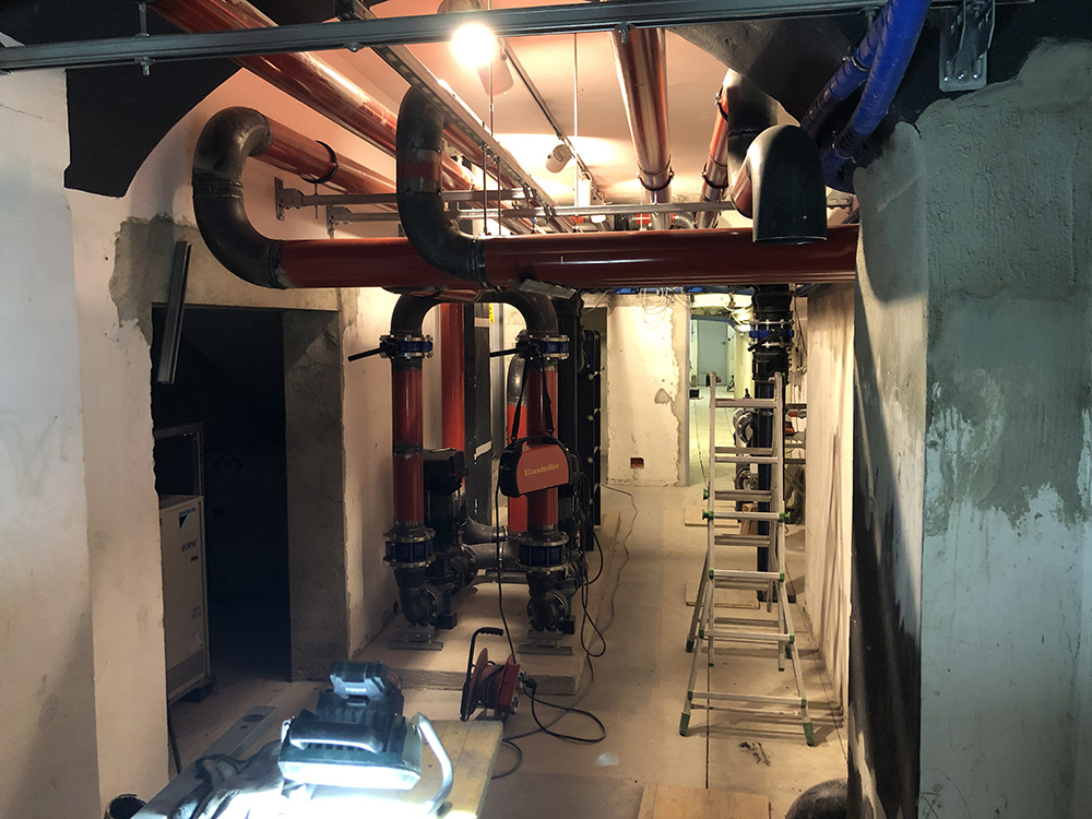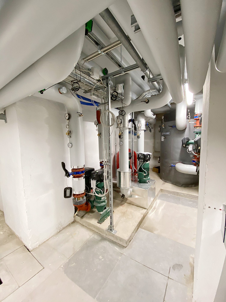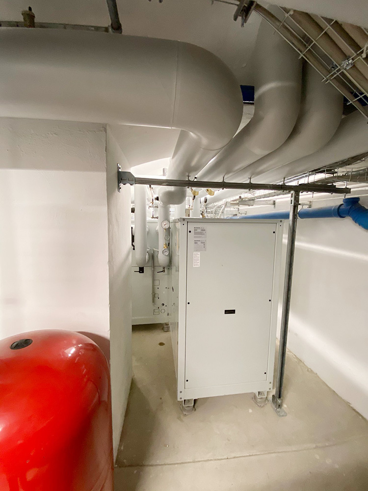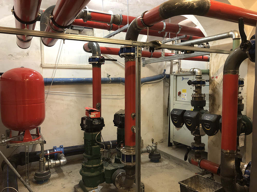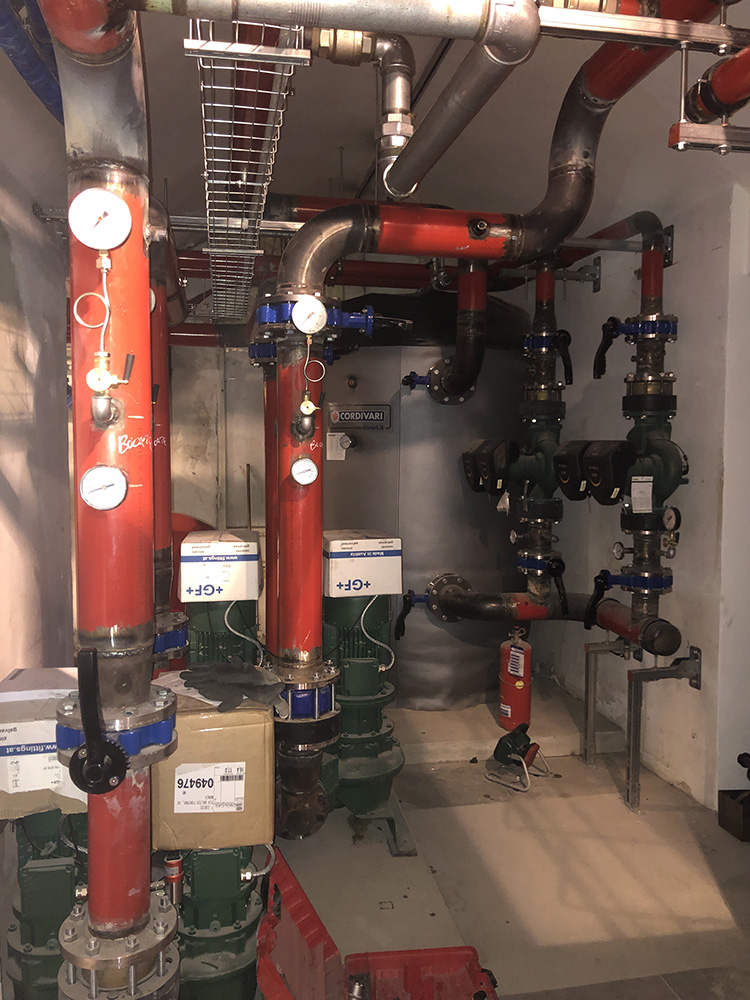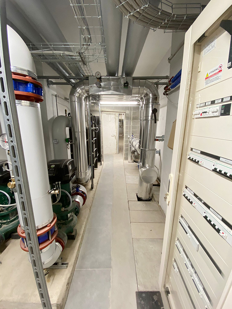 Ci siamo occupati di riqualificare la centrale termo-frigorifera dell’edificio. L’impianto esistente consisteva nella presenza di caldaie a gas per il riscaldamento invernale e gruppi refrigeratori per il raffrescamento estivo, che sono quindi stati dismessi.