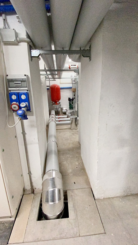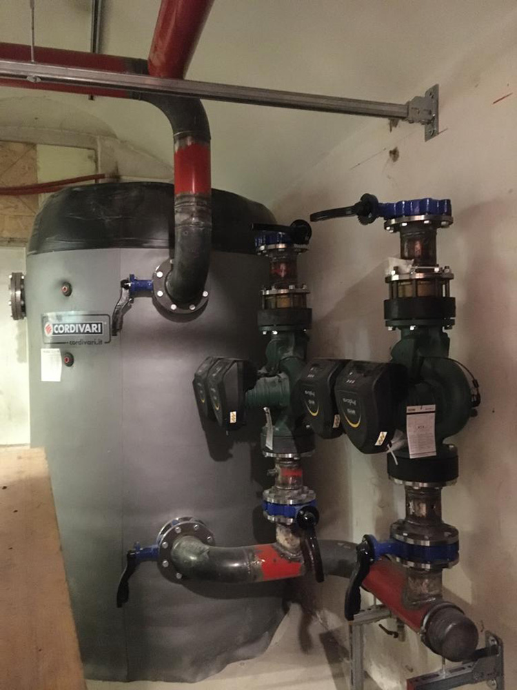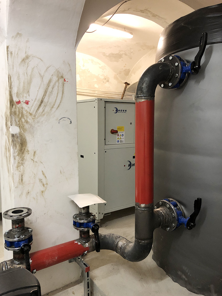 Abbiamo quindi provveduto ad installare delle nuove pompe di calore geotermiche con potenza di circa 450 kW, allacciando le stesse ai pozzi realizzati a cura della committenza. Le nuove pompe di calore, grazie anche all’installazione di nuovi booster per l’innalzamento della temperatura dell’acqua, sono asservite ai servizi di riscaldamento e raffrescamento dell’edificio.