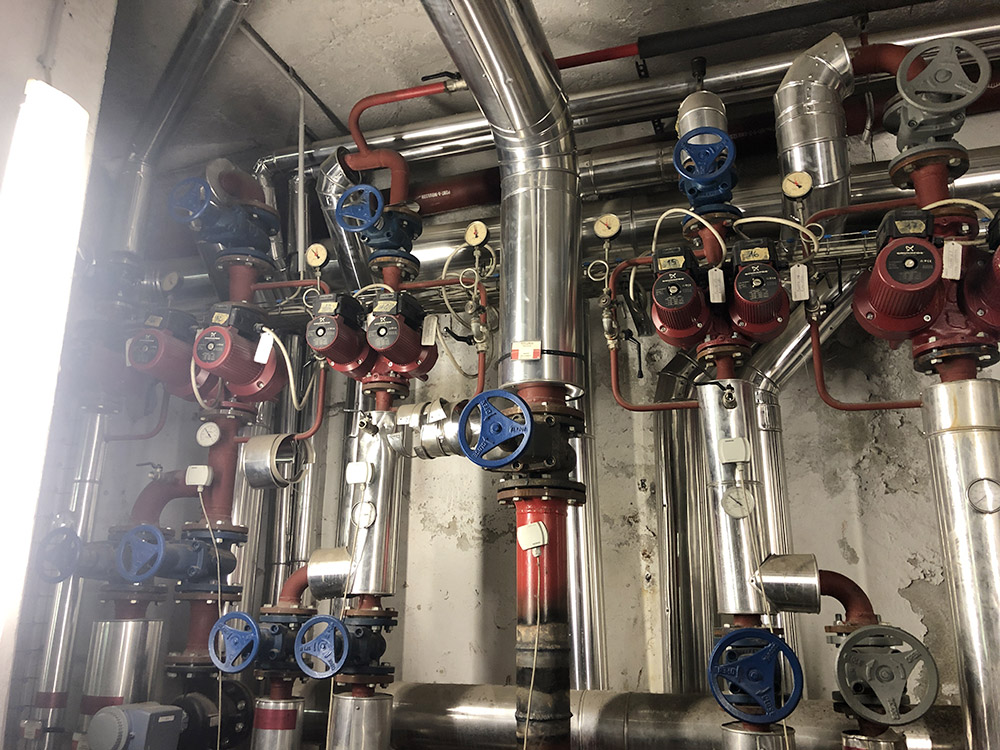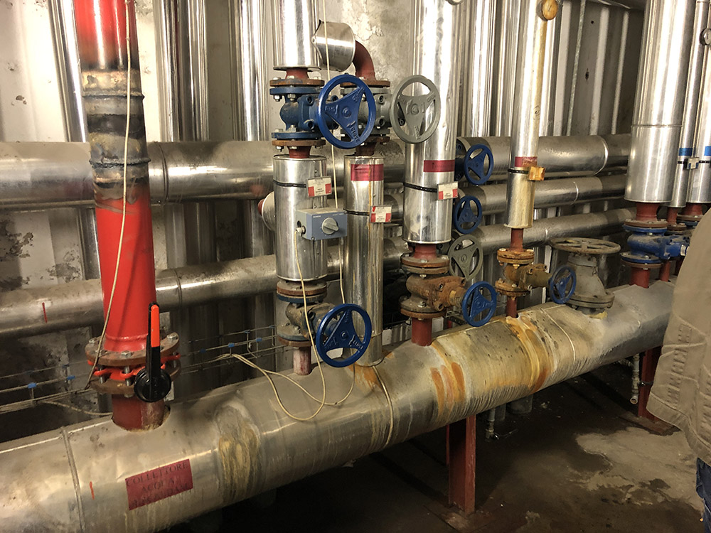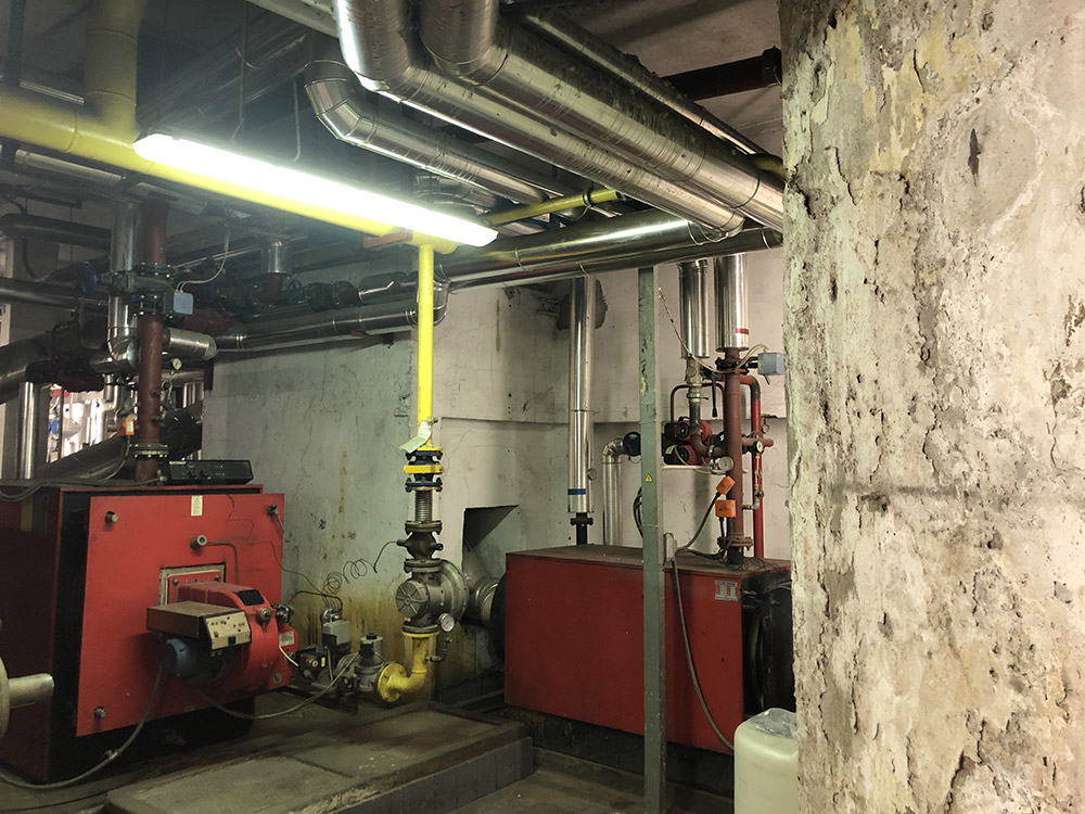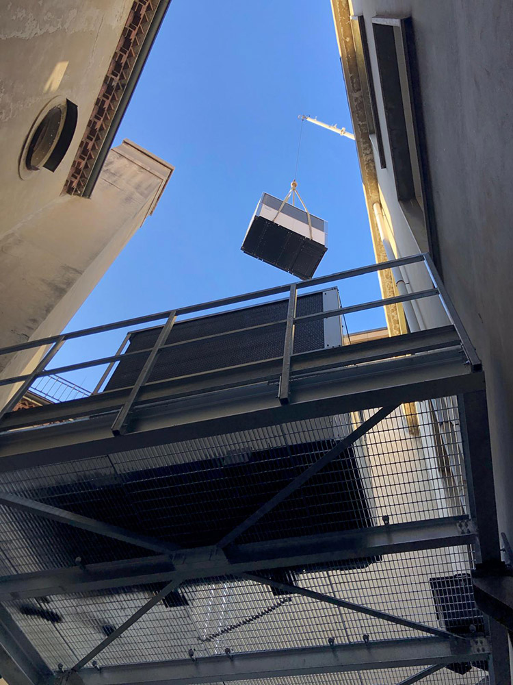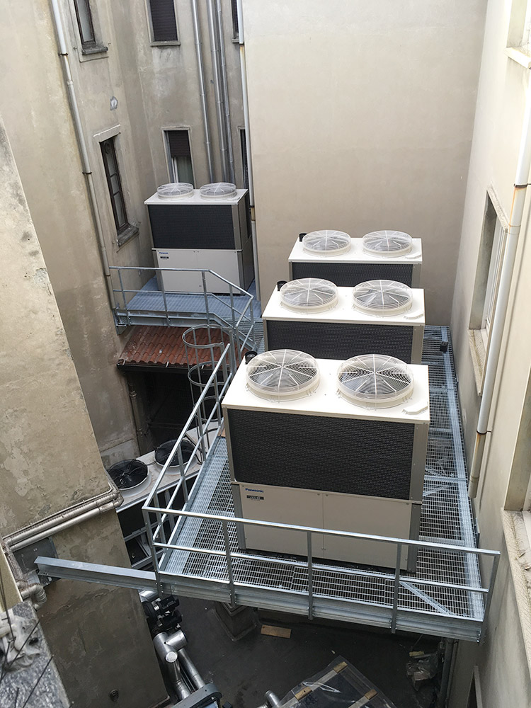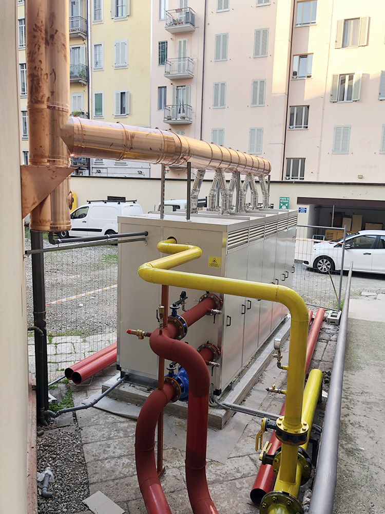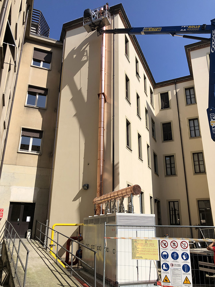 Abbiamo installato una nuova centrale termica con moduli termici a condensazione per una potenza di circa 1100 kW, con contestuale installazione ed allacciamento di pompe di calore e relativi accumuli inerziali, atte a soddisfare il riscaldamento nelle mezze stagioni ed il raffrescamento estivo. Le pompe di calore sono state installate presso un cortile interno dell’edificio, grazie all’ausilio di una gru, previa realizzazione di un impalcato metallico sospeso ed ancorato alla struttura esistente.